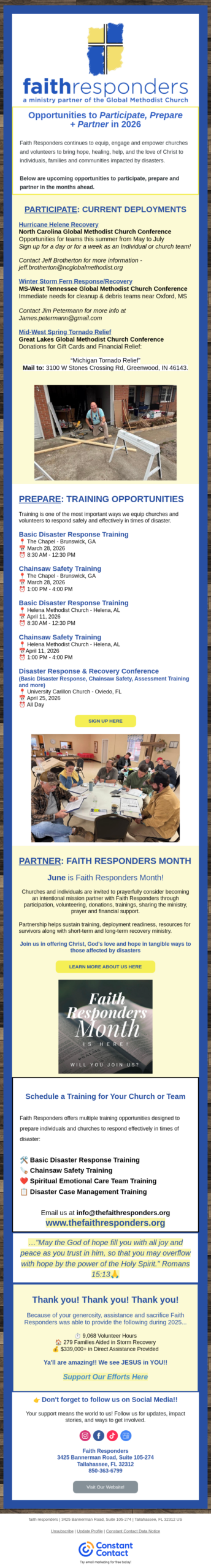First Methodist Church of Zephyrhills is a host campus for area repair and recovery efforts by Faith Responder volunteer groups. We receive regular updates from Director, Rev. Laura Lambert, which we will pass on as we are able. If you are interested in working with Faith Responders on a local volunteer basis, please contact one of our FR liaisons, Tana Day or Lorne Becker through the church office.