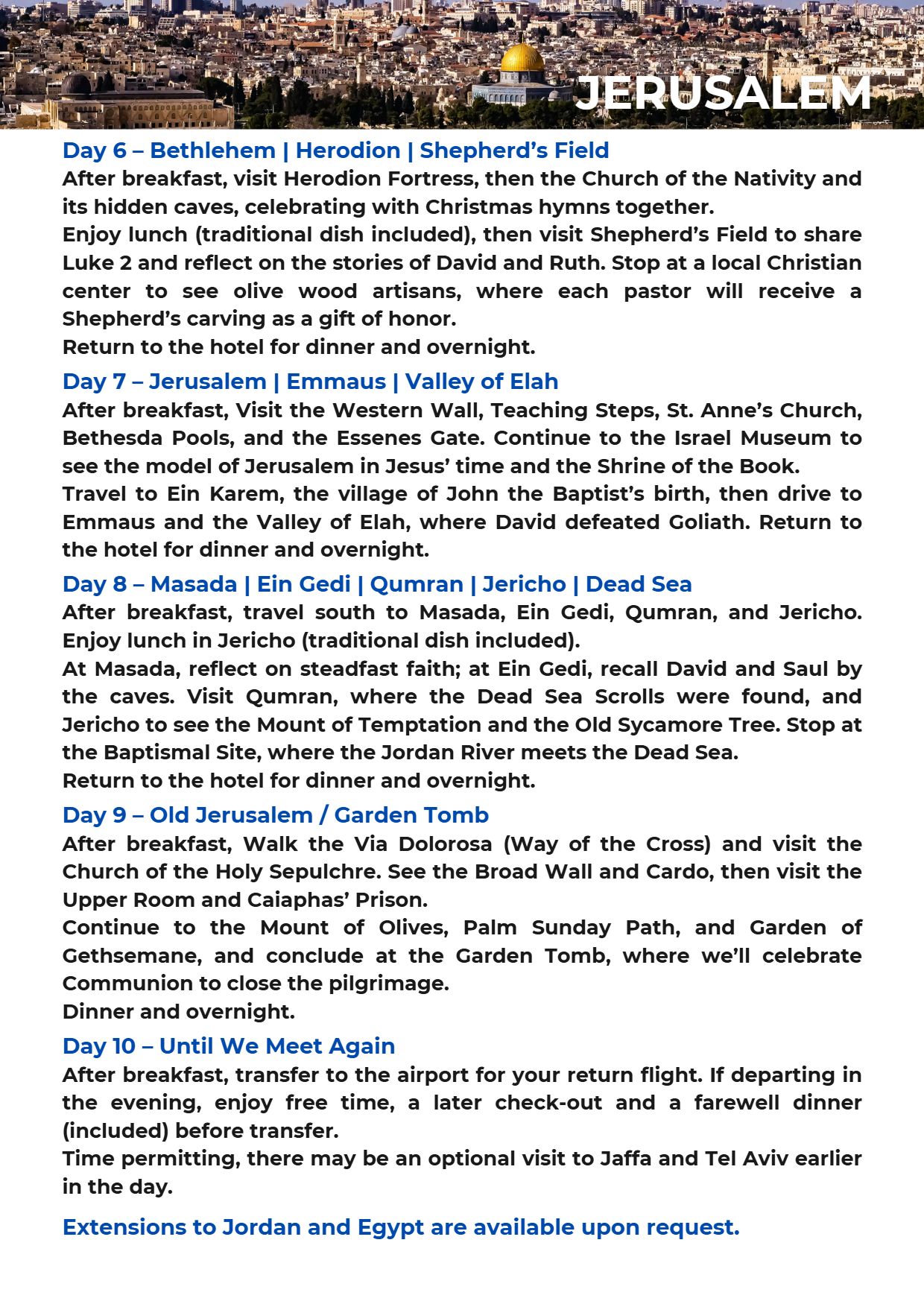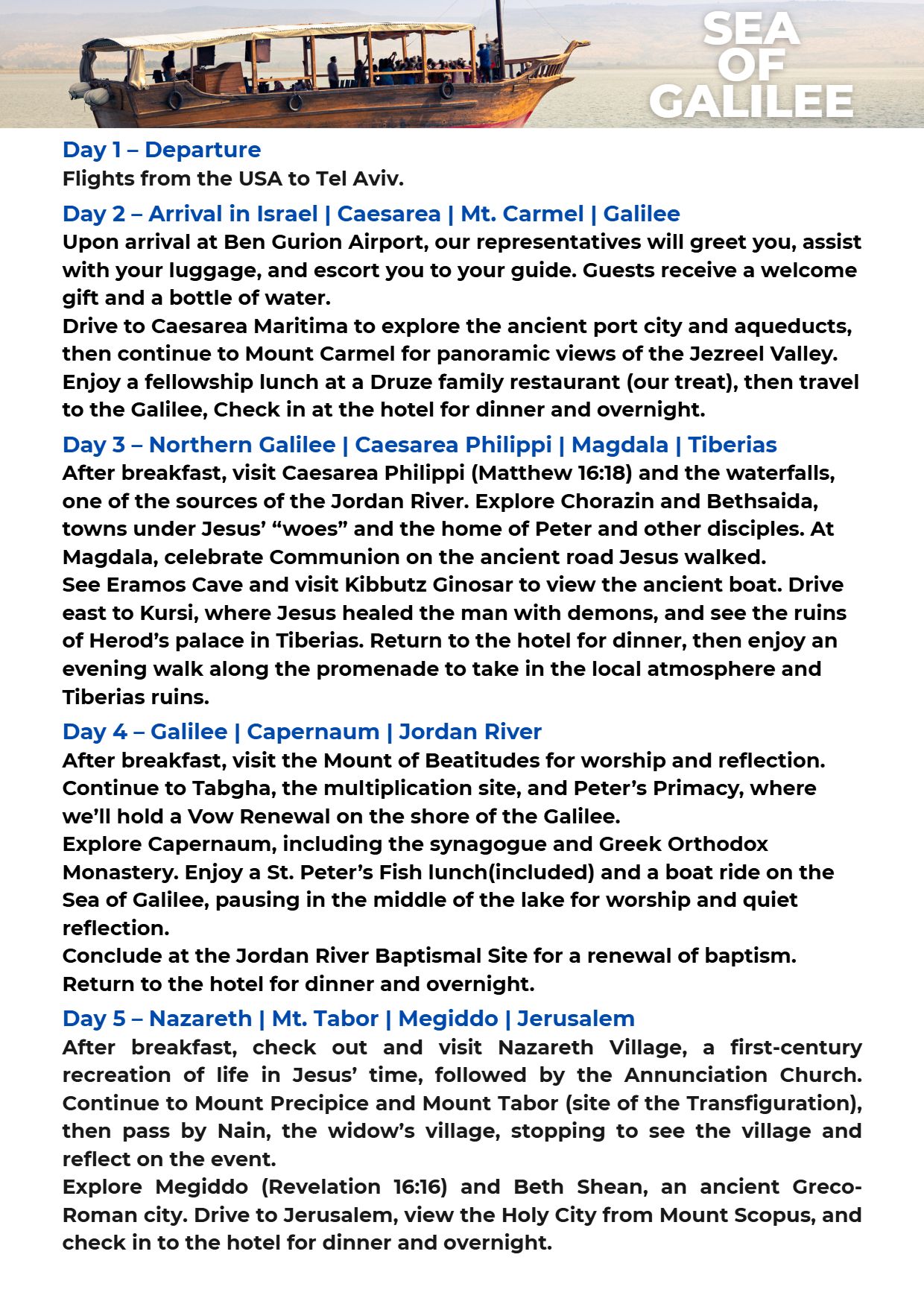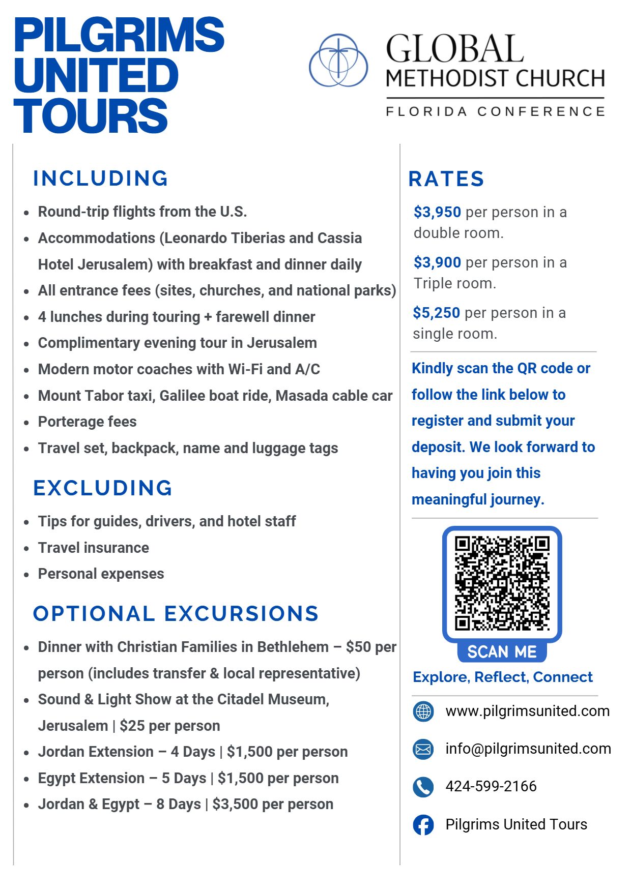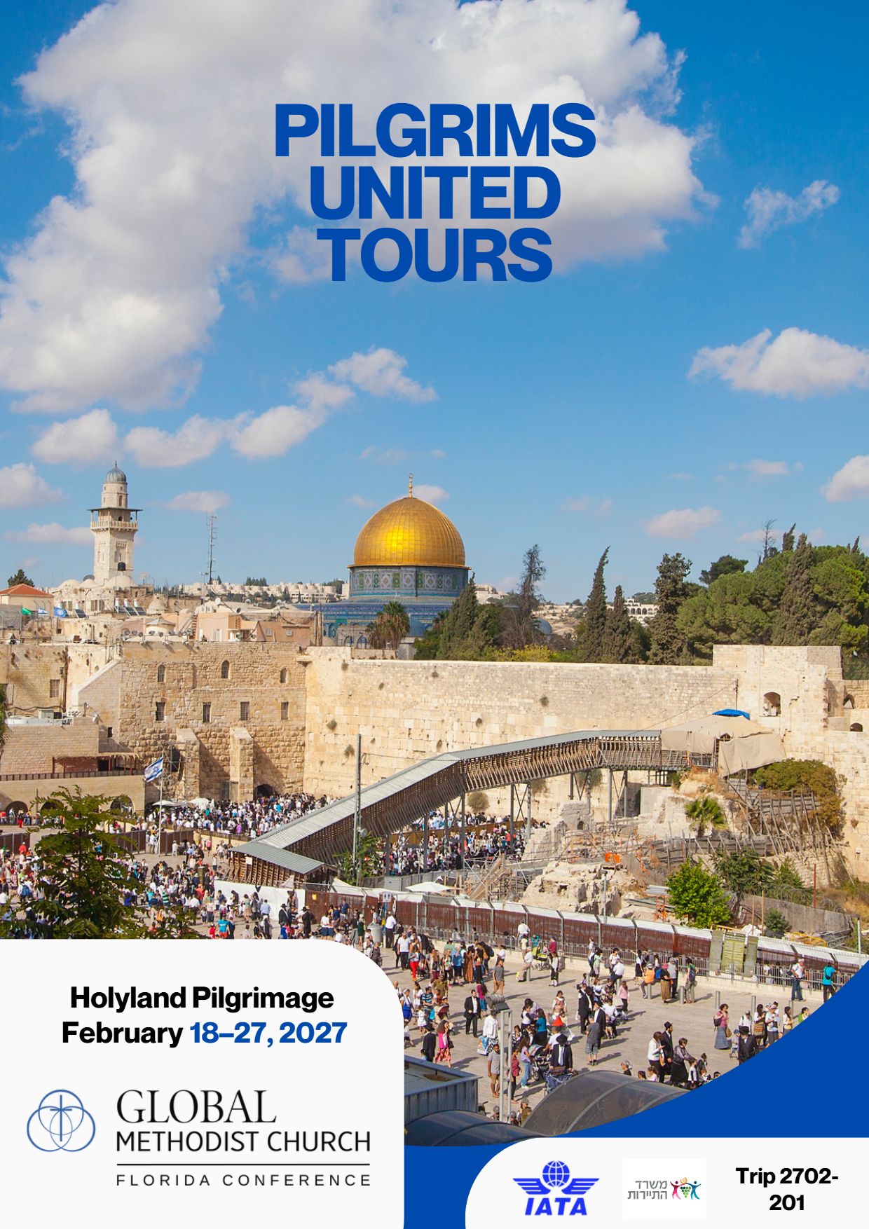 The Florida Conference of the Global Methodist Church is hosting a trip to the Holy Land (Israel) for its churches in February 2027. Pastor Steve will lead an informational meeting in Cooper Hall on Wednesday, April 15 from 5:30-6:30pm to go over the trip details. If we can get 5-10 people from our church to go, our group can stay together throughout the trip with Pastor Steve as our team leader. The price includes roundtrip airfare, good accommodations, breakfast and dinner daily, all entrance fees, and more. This is a reasonably priced comprehensive tour from Pilgrim United Tours (www.pilgrimsunited.com) that includes Bethlehem, Galilee, Capernaum, the Jordan River, Nazareth, Jerusalem, and much more! There are extras included that other Holy Trips do not include. Despite what you may see or read in the news, Israel is a safe place for tourism and will likely be even safer next February. The Israeli government is quite serious about ensuring the safety and security of tourists, visitors, and guests.